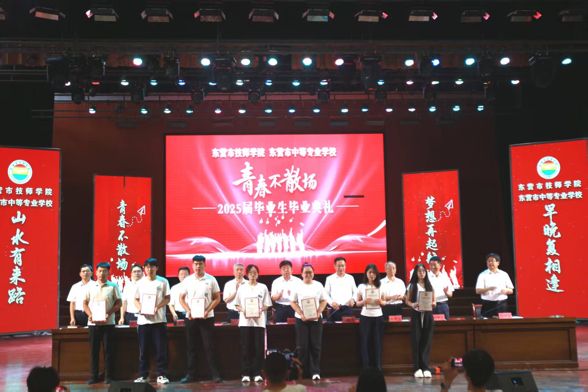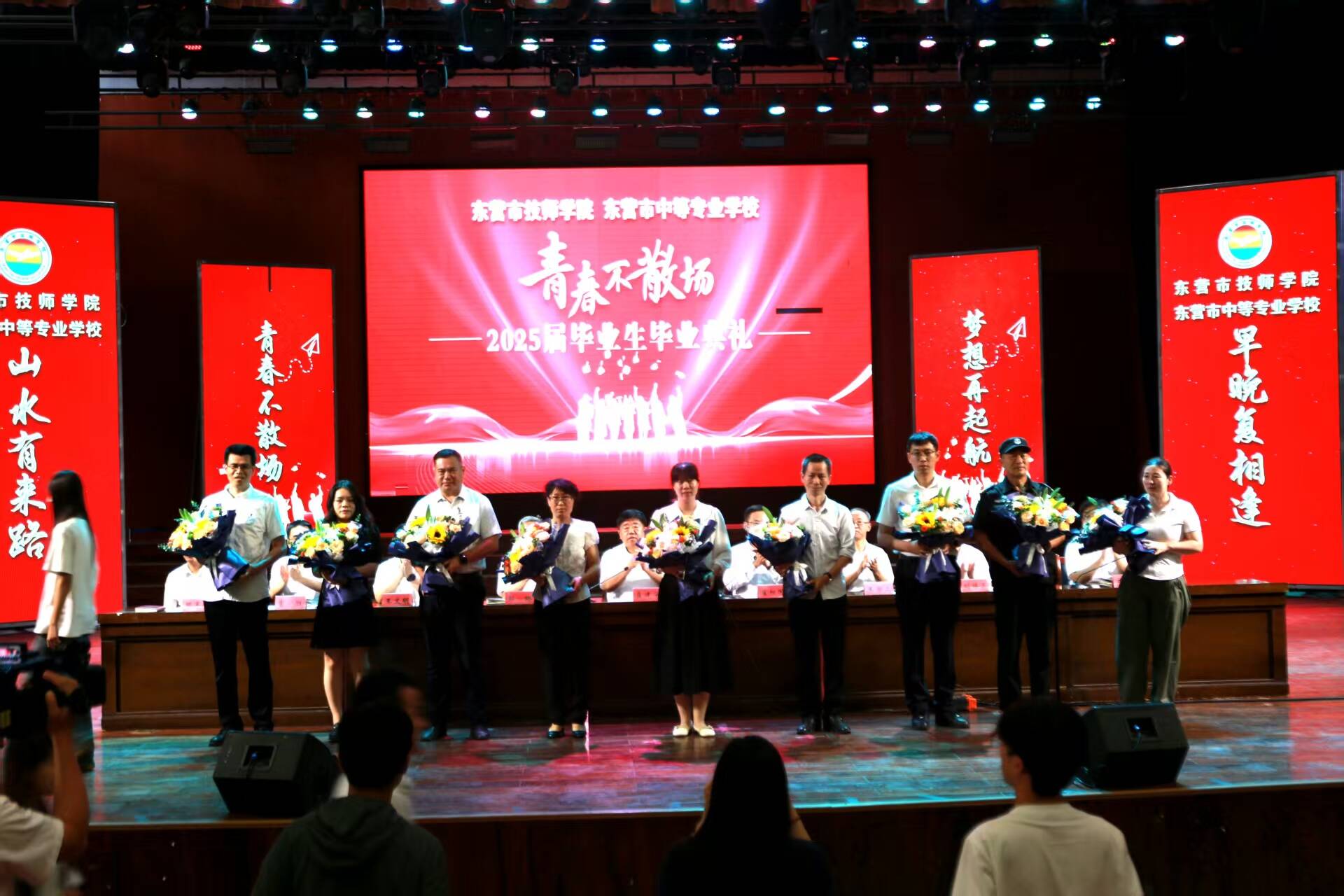 本报讯 6月12日上午,东营市技师学院、东营市中等专业学校2025届毕业生毕业典礼在学院报告厅隆重举行,学院党委书记崔建华致辞,党委副书记、院长崔相国主持。其他领导班子成员出席,相关处室负责人、各系班子成员、全体毕业班教师,保安、食堂工作人员代表,以及全体毕业生参加。