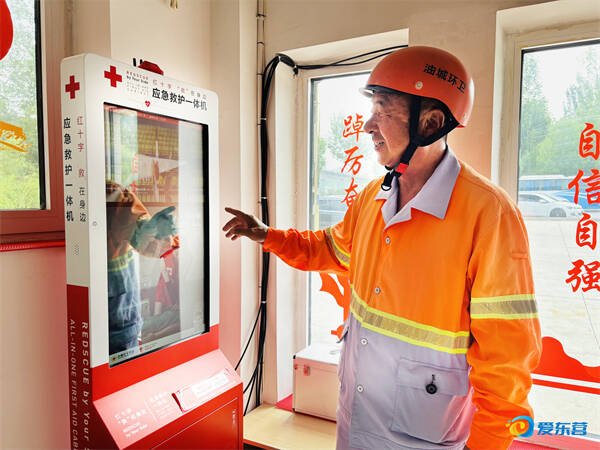 蒙山路户外劳动者驿站设应急救护一体机,守护“城市美容师”夏日安全。