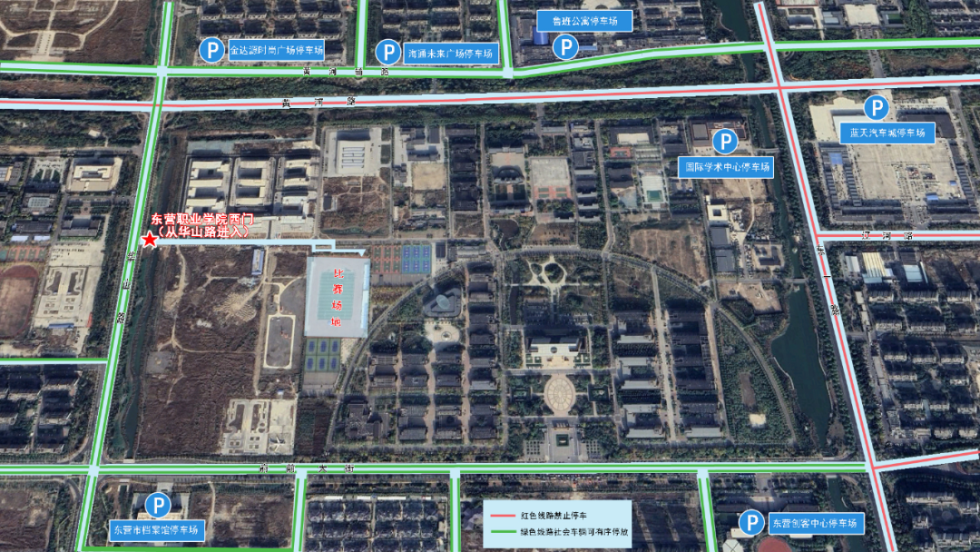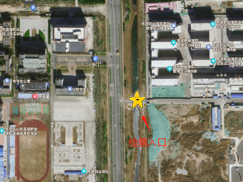 2.赛场入口:由东营职业学院西门进入出示身份证和购票二维码换取纸质票后入场,根据现场指引到达比赛场地,进场地前进行安检,安检后进入比赛场地,按购票号码入座观赛。