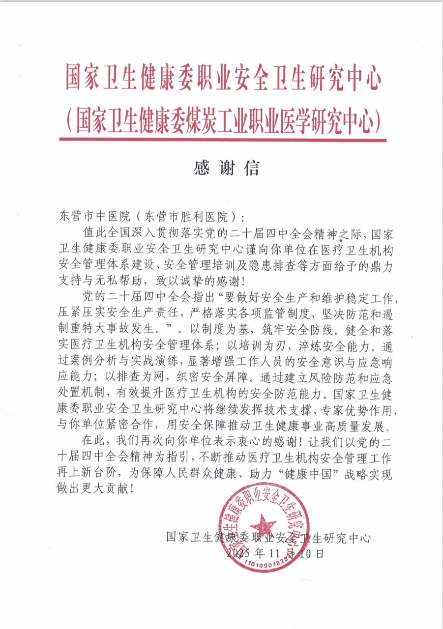 近日,东营市中医院(东营市胜利医院)获得国家卫生健康委职业安全卫生研究中心致谢。感谢信中充分肯定了医院此前承办医疗卫生机构安全生产管理培训班的组织工作,并就医院在安全体系建设、培训与隐患排查等方面提供的支持予以高度评价。