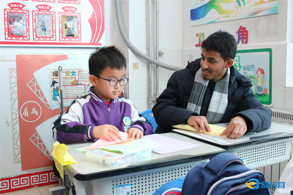 操场上,留学生们主动加入孩子们的行列,跟着整齐的节奏模仿动作,不同肤色的身影在阳光下舞动,陌生感在欢声笑语中悄然消散,纯粹的快乐成为此刻校园里最动人的语言。音乐课上,《阿里西里》的稚嫩歌声回荡校园;手工剪纸课上,留学生们在孩子们的耐心指导下,剪出寓意吉祥的精美图案,感受中国非遗文化的精妙;彩泥手工课上,中外学生携手揉捏创意,一件件充满巧思的作品承载着合作的喜悦;人工智能机器人课上,大家共同操控机器人完成任务,在科技的魅力中增进默契。“中国孩子的活力与热情让我深受感染,特色课程更是让我着迷!” 来自苏丹的留学生诺丁的话语道出了所有参与者的心声。