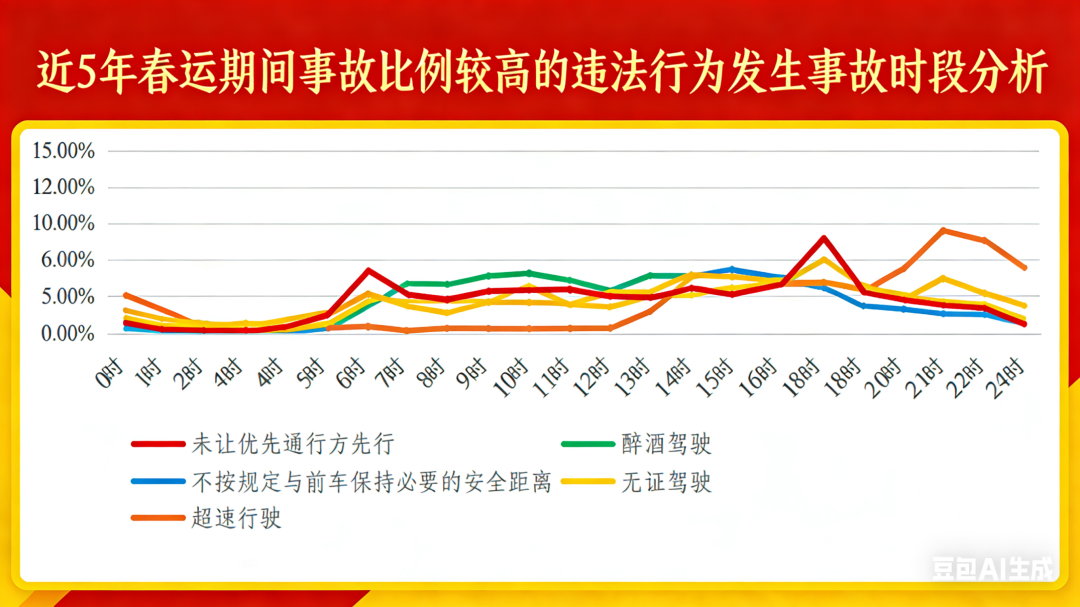 从近5年春运期间事故比例较高的违法行为发生事故时段分析: