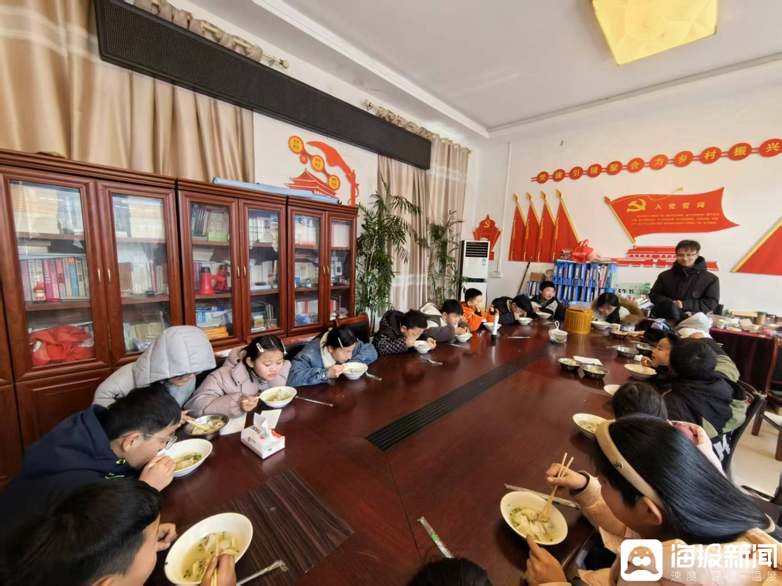 农历小年这天中午,村委会的大锅里煮着热腾腾的饺子。王浩和孩子们围坐在一起,共同庆祝这个传统节日。他自己经常忙得顾不上吃饭,一碗泡面解决一餐是常事,今天陪着孩子们一起,这顿饺子他吃得格外香。