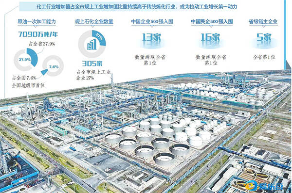 东营市是全国最大的石油化工产业基地,原油一次加工能力达到7090万吨/年,占全省的37.9%、全国的7.6%,稳居全国地级市首位。全市现有规模以上石化企业305家,2025年实现营业收入6270.3亿元,占全市工业总营收的64%。